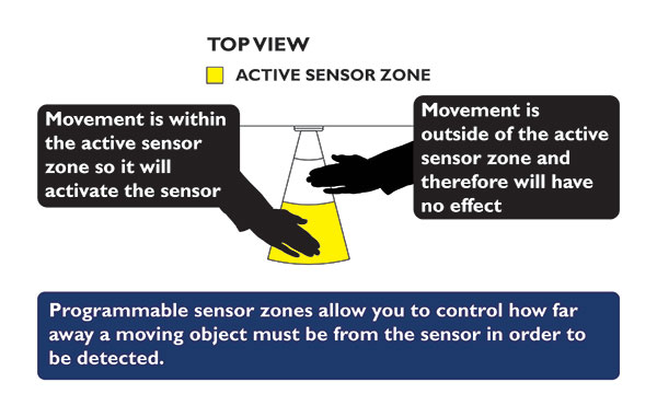 - Capteur d’activation à infrarouge — l’interrupteur sans contact de Sensotech possède des limites plus précises, une distance d’activation moindre (elle peut être calibrée à pratiquement 0 po de la face du capteur)